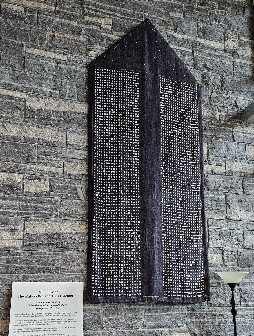 Sarah Haskell’s artwork incorporates regimented rows of 3,116 – one for each life lost -- bone-colored buttons lined up across the dark linen handwoven backdrop as an abstract representation of the Twin Towers.